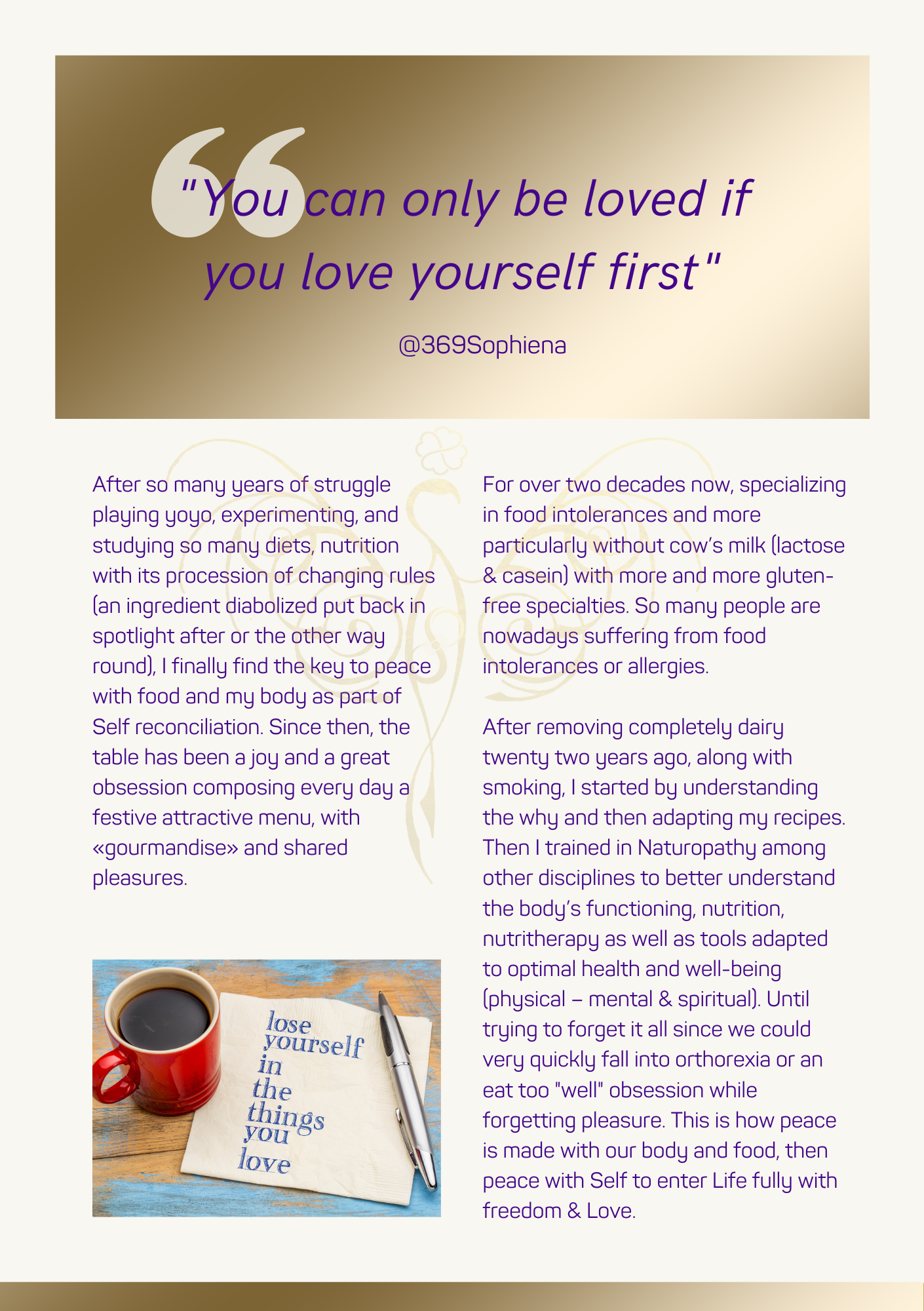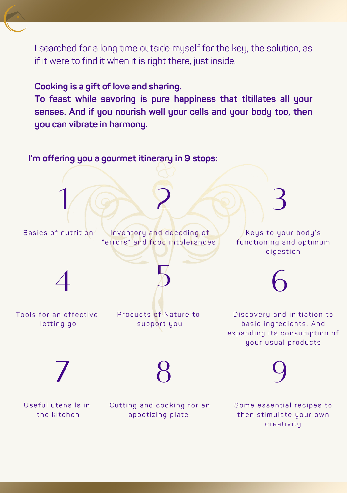 Nothing prohibited since frustration leads to compulsions and excesses. It all starts in the brain, and this is where we begin our “journey”. A few easy-to-use tools for a necessary letting go. Then some interesting and useful nutrition notions. Once we know, we can choose to avoid errors. We resist, or we give in knowingly and without feeling guilty…